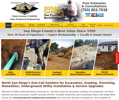 "description": "Hidden Valley Backhoe & Trucking is a licensed, highly experienced general engineering contractor that specializes in providing excavation and backhoe services throughout San Diego County including Encinitas, Oceanside, Escondido, Carlsbad, San Marcos, Fallbrook & surrounding cities. Our services include concrete/asphalt demolition, structural demolition, land clearing, hauling, excavating, trenching, underground utility installation, soil compaction, rough grading, finish grading, soil import/export, and concrete/asphalt repairs. Were a San Diego Gas and Electric Certified Gas Pipeline Backfiller and can be counted on to comply with all relevant building codes. Additionally, we stand behind our work with a written guarantee.",