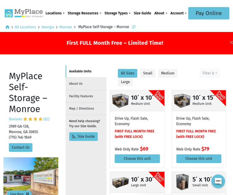 "description": "Located off Highway 138, MyPlace Self-Storage in Monroe, GA, offers spacious storage units with 24-hour access for personal or commercial use. Perfect for storing furniture, seasonal items, or business inventory, we serve Monroe, Youth, Good Hope, and Bold Springs. With drive-up access and convenient RV and boat storage options, MyPlace Self-Storage Monroe provides secure and flexible solutions for your needs. Rent or reserve your unit today for hassle-free storage!",