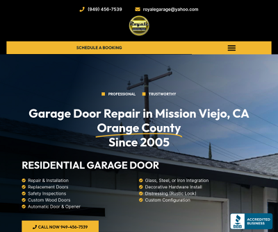 At Royale Garage Door Service, Inc. we take pride in our work and our reputation. Thats why we back everything we do with an outstanding warranty. Based in Mission Viejo, CA, we service, install, and replace garage doors from North Orange County to San Clemente. As the largest moving part in your home, the safe, secure, and efficient operation of your garage door in Mission Viejo is essential. Why leave it to an underqualified technician to attempt its repair? Call Royale Garage Door Service, Inc.