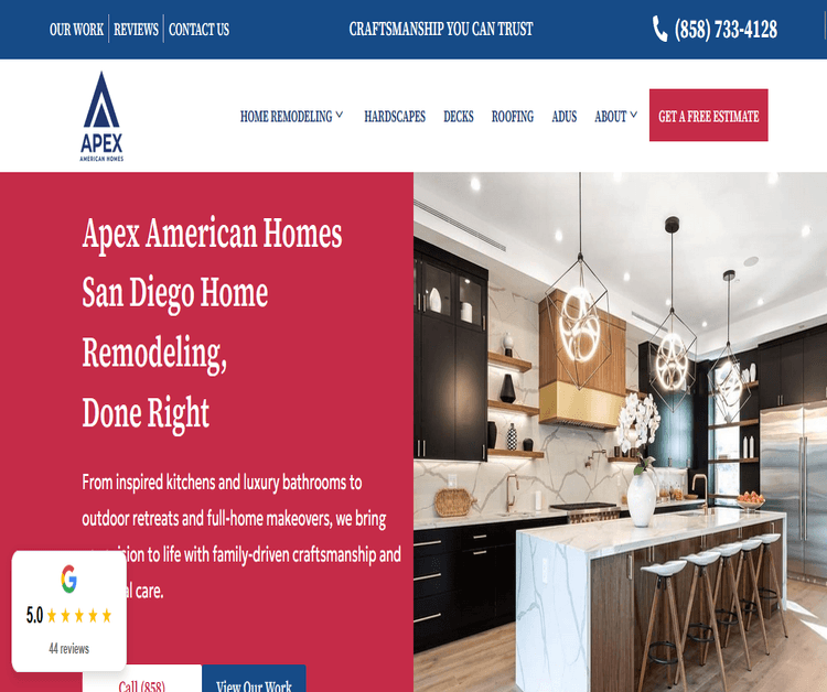 Apex American Homes is a trusted remodeling company in San Diego, CA, offering expert kitchen, bath, ADU, roofing, patio, and landscape construction services across San Diego County. We provide personalized service, military/senior discounts, and financing options. Licensed, bonded, insured. || Phone: 858-733-4128