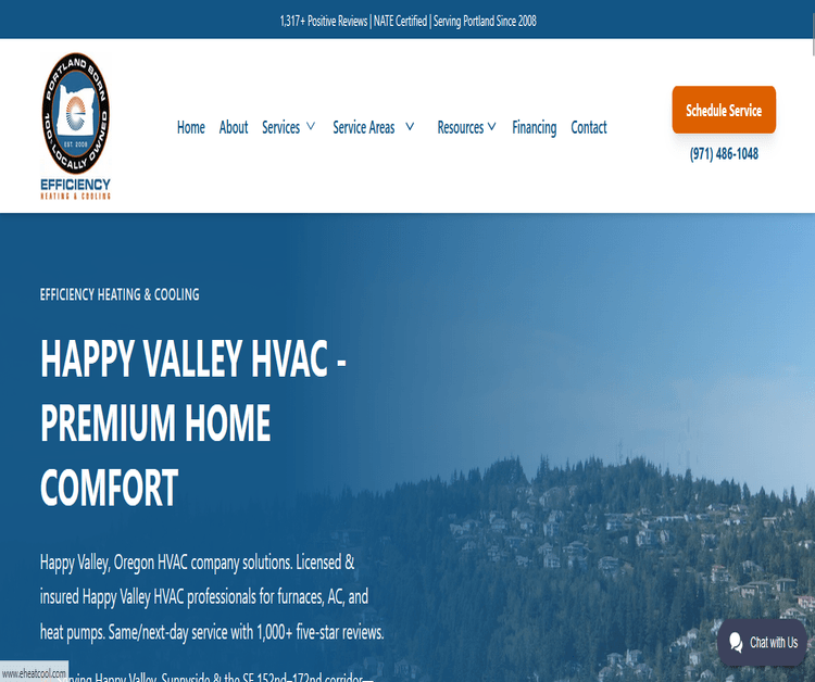 Efficiency Heating & Cooling is a family-owned and operated HVAC company serving the Portland metro area, including Happy Valley, Oregon, since 2008. As a NATE-certified and Bryant Factory Authorized Dealer, we specialize in heating, cooling, and indoor air quality solutions for residential and commercial properties. Our services include installation, repair, and maintenance of furnaces, air conditioners, heat pumps, ductless systems, and propane heating. We address local climate challenges like humidity, pollen, and wildfire smoke with energy-efficient options. With over 1,200 five-star reviews, we offer 24/7 emergency service, same-day appointments, and financing. Committed to trustworthiness, we provide transparent pricing and serve rural and urban homes alike for optimal comfort. Licensed, bonded, and insured with Oregon CCB #187834.
