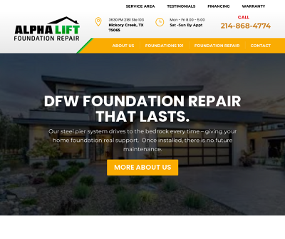 AlphaLift Foundation Repair is a leading foundation repair company in the Dallas-Fort Worth area, specializing in advanced steel pier systems. With over 25 years of experience, they offer expert solutions for both residential and commercial foundation issues, including concrete slab repair and elevation correction.